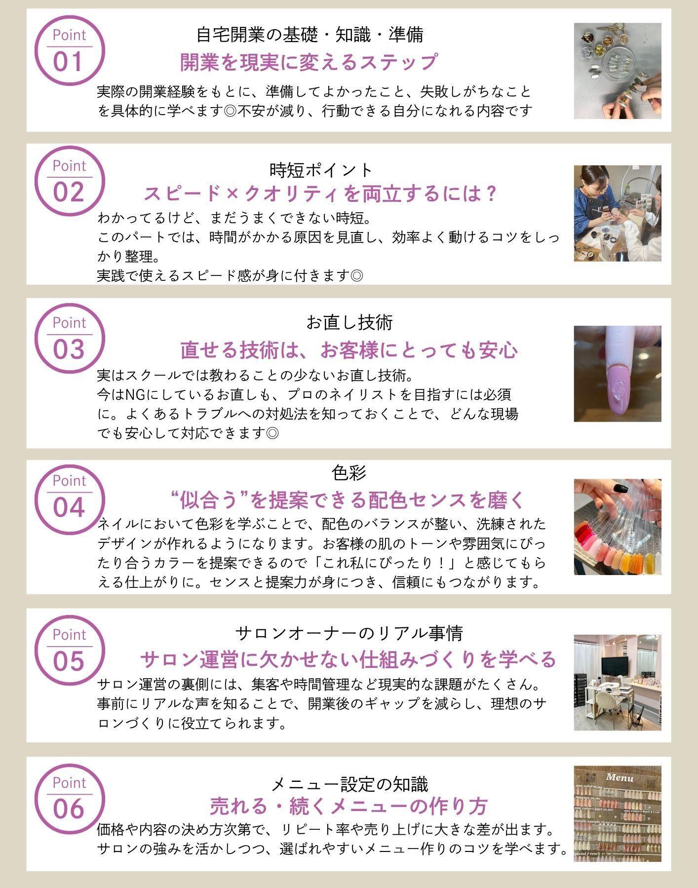 【座学編】ミニモを使った集客方法お客様の来店からお帰りまでの流れ爪の名称、トラブル、道具の手入れ方法ジェルの基礎知識